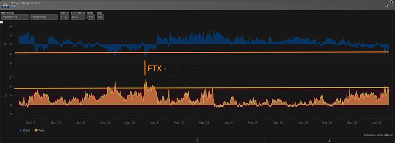 The put wing (30-dte, ∆25) is pricing in the same premium to ATM vol (ratio) as the November 2022 FTX crisis.